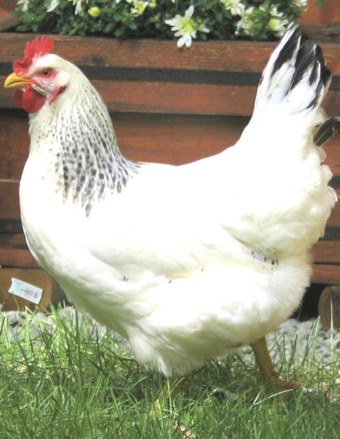 A cross between the Barred Rock and New Hampshire Red, the Delaware is a very large, cold hardy breed that's white with black accents on the neck and tail.